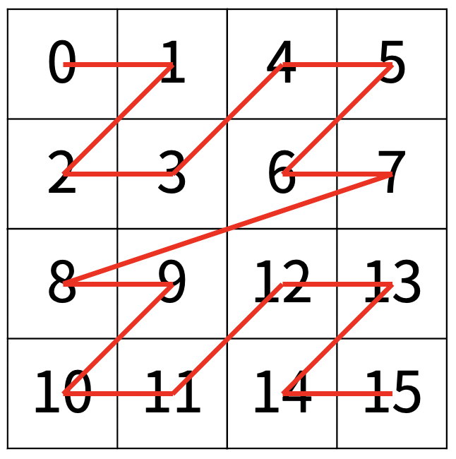 한수는 크기가 2N × 2N인 2차원 배열을 Z모양으로 탐색하려고 한다. 예를 들어, 2×2배열을 왼쪽 위칸, 오른쪽 위칸, 왼쪽 아래칸, 오른쪽 아래칸 순서대로 방문하면 Z모양이다.